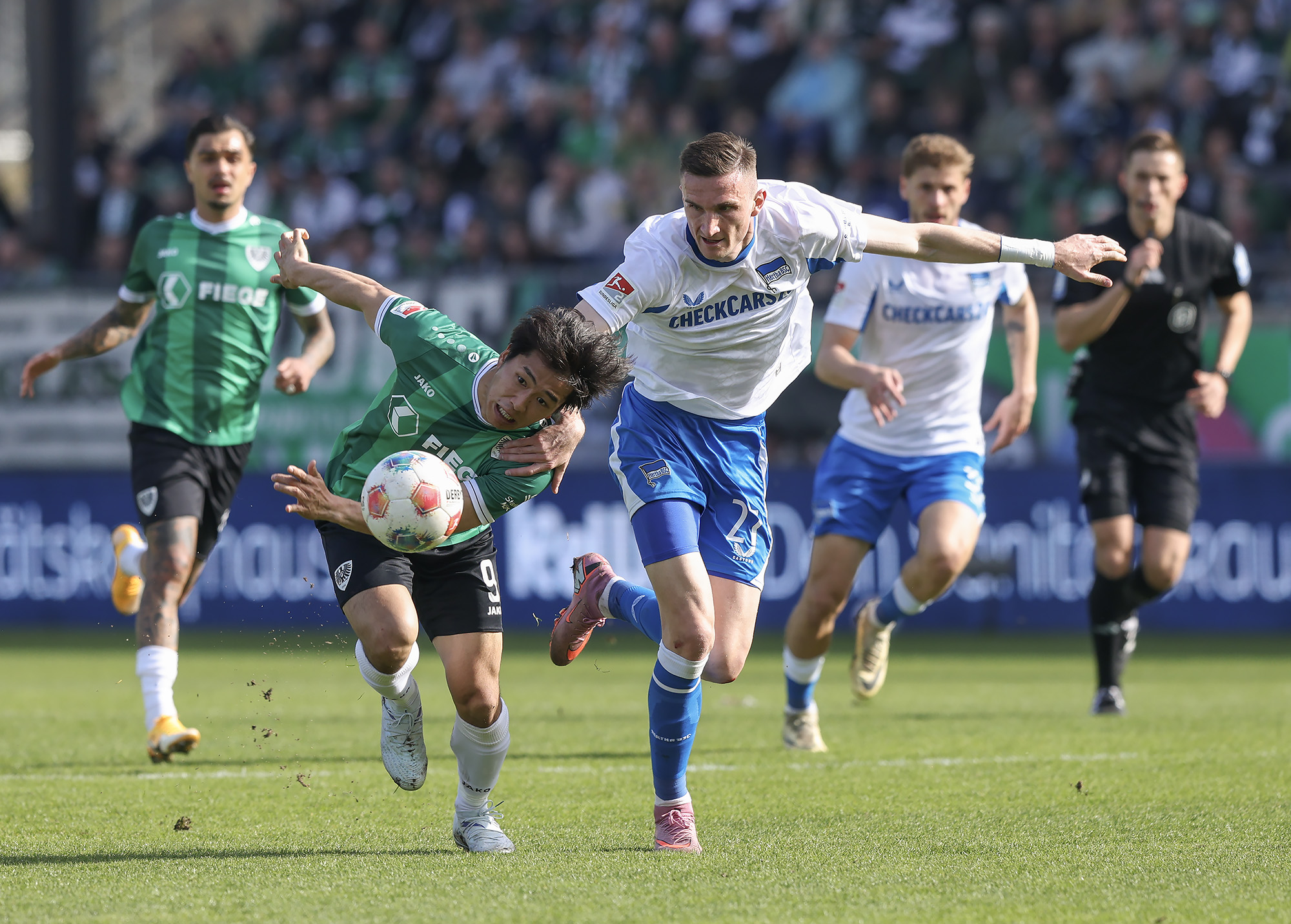 Auf dem Platz dauerte es ein wenig, bis die Teams in Fahrt kamen. Mit der ersten ansehnlichen Kombination ergab sich jedoch direkt die Möglichkeit für den SCP in Führung zu gehen. Allerdings verpasste es Imad Rondic bei seinem Kopfball aus kurzer Distanz ausreichend Druck hinter das Leder zu setzen (9.). Gleiches galt auch für Marvin Schulz‘ Versuch aus der zweiten Reihe (22.). Bei der Hertha, die im ersten Durchgang deutlich mehr vom Spiel hatte (60 % Ballbesitz), entwickelte vor allem Winterneuzugang Josip Brekalo Gefahr. Sein erster Abschluss lies das Außennetz zappeln (14.), der zweite Versuch segelte nur wenige Zentimeter am langen Pfosten vorbei (31.). Kurz vor dem Pausenpfiff kam es zum Schreckmoment für die Gastgeber. Michael Cuisance war im Sechzehner zu Boden gegangen, Schiedsrichter Felix Bickel wurde zum VAR-Monitor gebeten. Dort konnte der Unparteiische nichts erkennen, da ein Zuschauer den Stecker der technischen Anlage gezogen hatte. Videoassistentin Katrin Rafalski verwies jedoch auf einen Tritt ans Schienbein durch Niko Koulis. Die Entscheidung: Elfmeter! Hertha-Kapitän Fabian Reese ließ sich nicht zweimal bitten und versenkte den Ball ins untere rechte Eck zum 0:1-Pausenstand (45.+5).